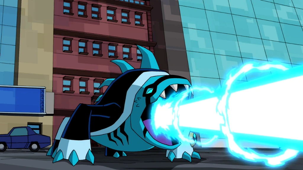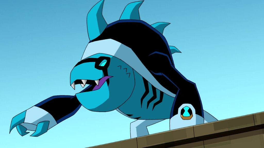Es de color celeste, posee un traje azul claro con el pecho y el abdomen al descubierto. Posee el símbolo del Omnitrix en su mano izquierda y sus ojos son celestes.