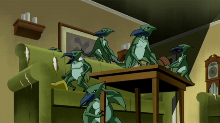 - Todos confunden a los pterodáctilos con dragones (al parecer no saben mucho de dinosaurios, aunque luego Gwen se da cuenta de que son pterodáctilos porque dice que ellos evolucionaron y se convirtieron en gallinas).