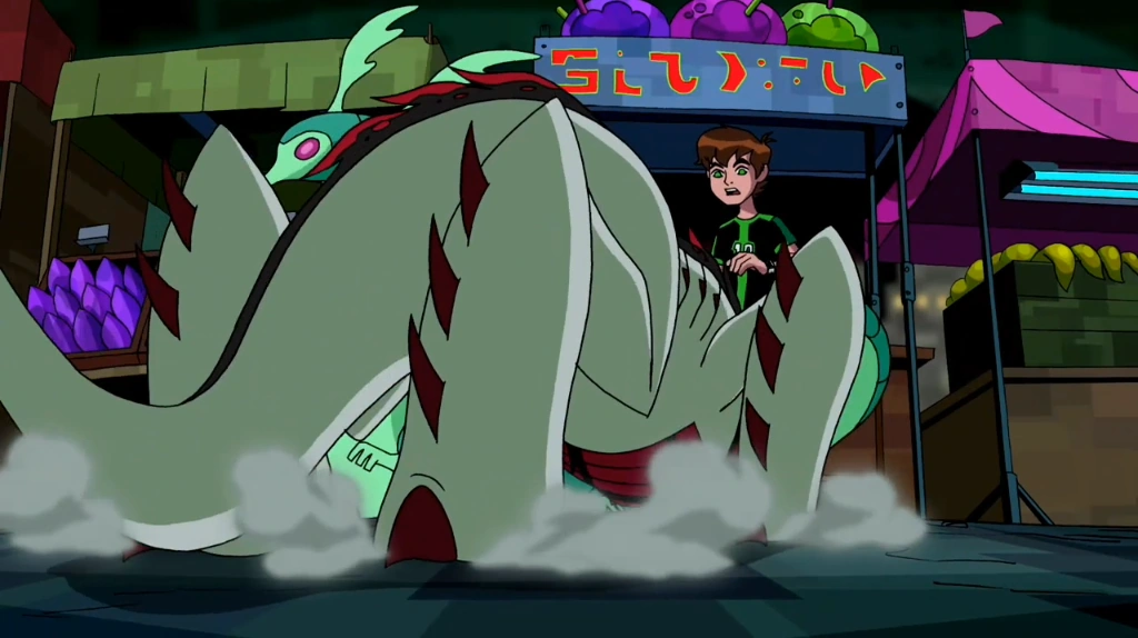 alienígenas y el conductor va a la próxima parada, pero Rook le advierte que no tiene frenos pero a Ben no le importa. Khyber con su perro recorren el túnel cuando encuentran pistas de Ben, un poco de radiación y vías destruidas, así que le ordena a su perro que se transforme en Buglizard y lo atrape. Ben y Rook pasean por la ciudad, Rook se concentra en encontrar a los fugitivos pero Ben tiene mucha hambre y le quiere comprar un tentáculo a un vendedor mientras Rook los interrumpe y les dice si vio a los malos, pero el vendedor sospechosamente escapa y Ben lo perdona, ellos charlan de sobre como Rook entrenaba en su planeta, pero justo el Perro de Khyber en Buglizard ataca a Ben, el selecciona el holograma de