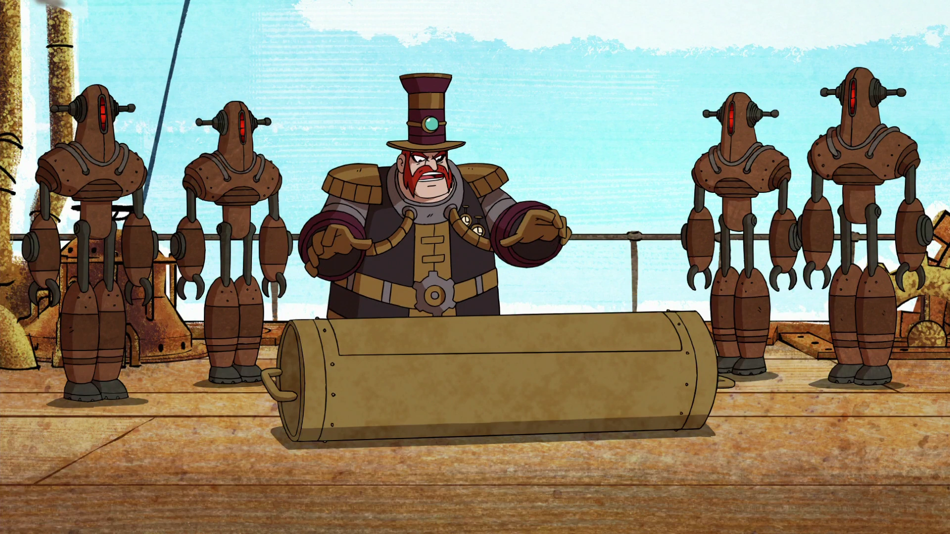 Aunque Fuego logró vencer a los Mecanoides, Vapor se adueño de la cápsula y se la llevó hacia su dirigible. Cuando estaba a punto de abrir la cápsula, lo sorprende Ultra-T mejorando al Rustbucket.