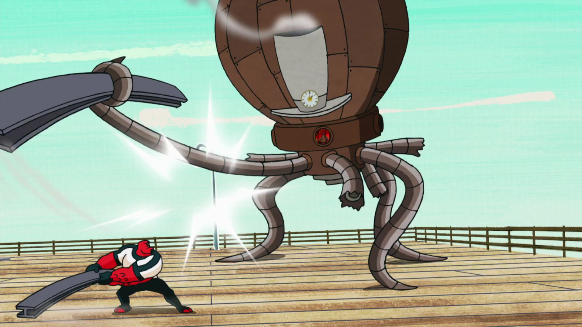 Cuatrobrazos y el Relopulpo agarran una gran viga de construcción metálica y empiezan a luchar como si fuera una competencia de esgrima, hasta que Cuatrobrazos logra tirar al Relopulpo al mar.