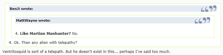 - La descripción de Ventrilosquid encaja con los cefalópodos telepáticos de Ben 10 (Reboot), siendo cefalópodos alienígenas sensibles y telepáticos.