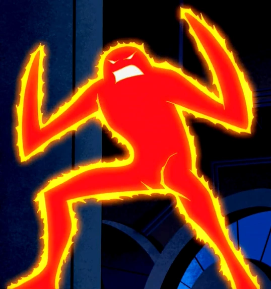 Rimossa la tuta, il suo vero aspetto è di un essere umanoide fatto di pura energia radioattiva luminosa rossa e gialla.