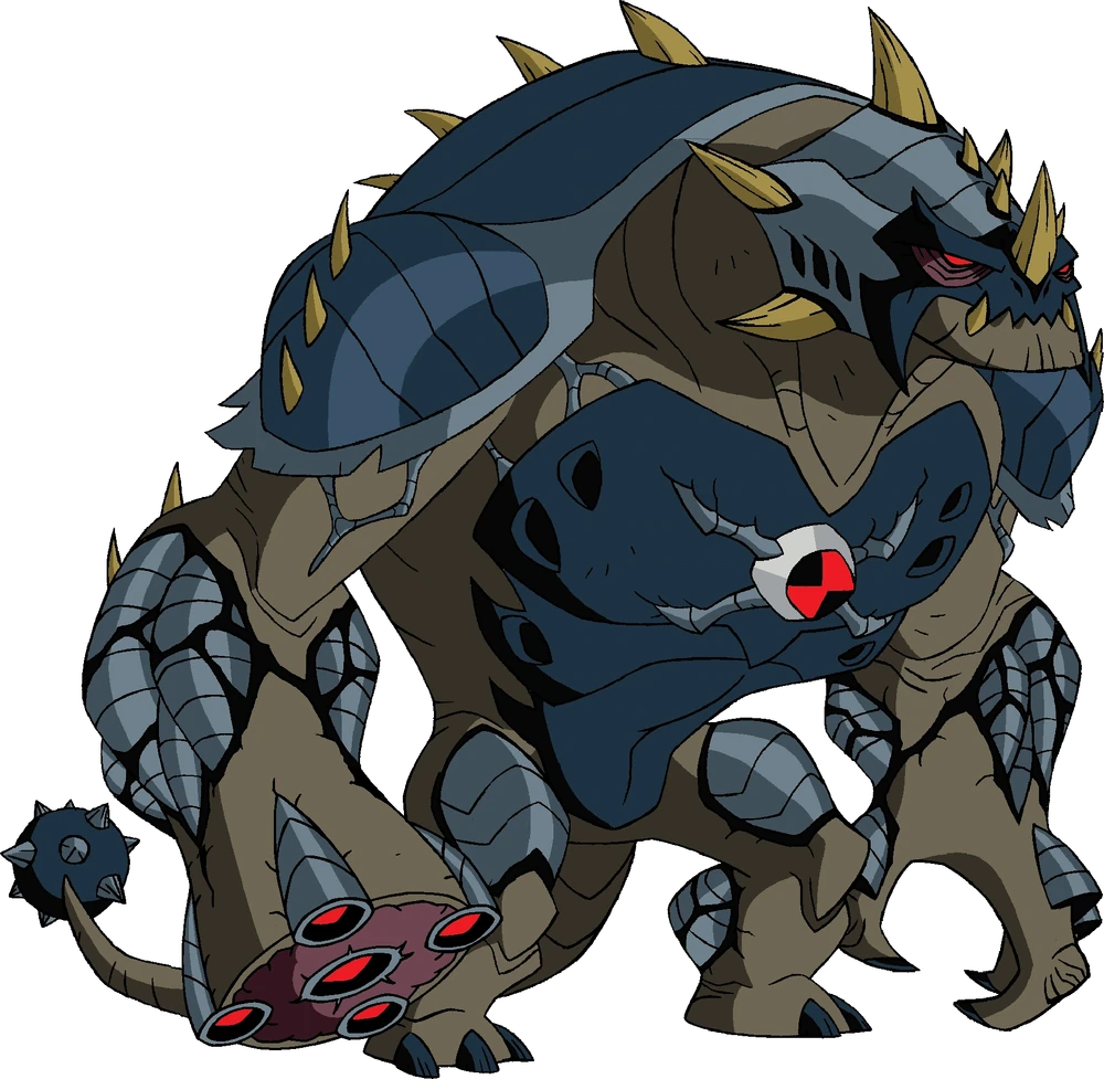 Ha la pelle verde mimetico e il suo elmo ha tre punte d'argento che corrono lungo la parte superiore e due corna nere rivolte verso il basso sui lati. La sua armatura posteriore ha lunghe punte che corrono lungo ogni lato, il petto placcato e il busto sono blu scuro con cinque punte su ciascuna estremità e la sua coda ha una mazza blu all'estremità di esso, con punte d'argento.