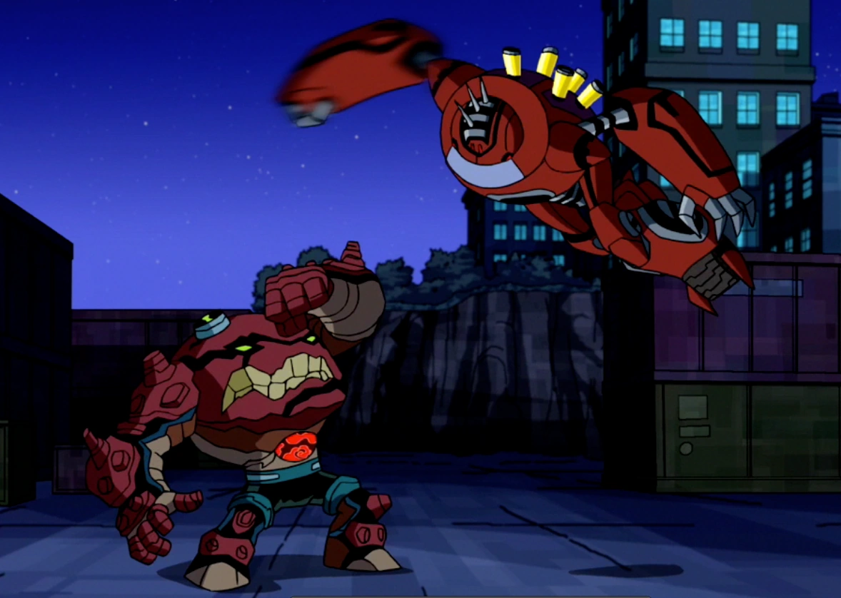 Nagle przestępca z rękami robota i białymi włosami dostrzega, że dwie bateryjki uciekły. Drugi, z czerwonymi włosami, chce po cichu zaatakować Bena i Rooka, lecz oni atakują pierwsi powalając go. Białowłosy łapie ich w pole energetyczne. W tym czasie wchodzi Corvo i Piącha, zły, że musiał przerwać trening przez dwóch szpiegów. Wynika z tego, że Piącha kradnie nielegalne technologie. Rook używa neutralizatora pól elektrycznych i uwalnia się. Ben przekształca się w Bloxxa i atakuje opryszków. Rook zajmuje się czerwonowłosym bandytą i, używając Proto-Sprzętu, niszczy jedną roborękę. Ben powraca do swojej formy i Piącha wskakuje do mechazbroi z 12 poziomu. Ben, chcąc przekształcić się w Czterorękiego, zmienia się w nowego Gravattacka, którego niezbyt wie jak używać.