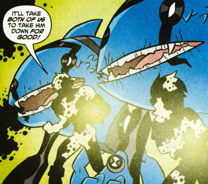 Porém, Ben percebe que Kevin estava usando-o para fazer o mal, ameaçando vidas por mera diversão. E Ben imediatamente é contra o plano que Kevin teve de colidir dois trens, dizendo que centenas de pessoas inocentes iriam morrer no processo. No entanto, Kevin mostra nenhuma consideração pelas pessoas e Ben decide para pará-lo, antes que seja tarde demais. Então, Ben tenta se tornar Quatro Braços, mas é transformado em Chama.