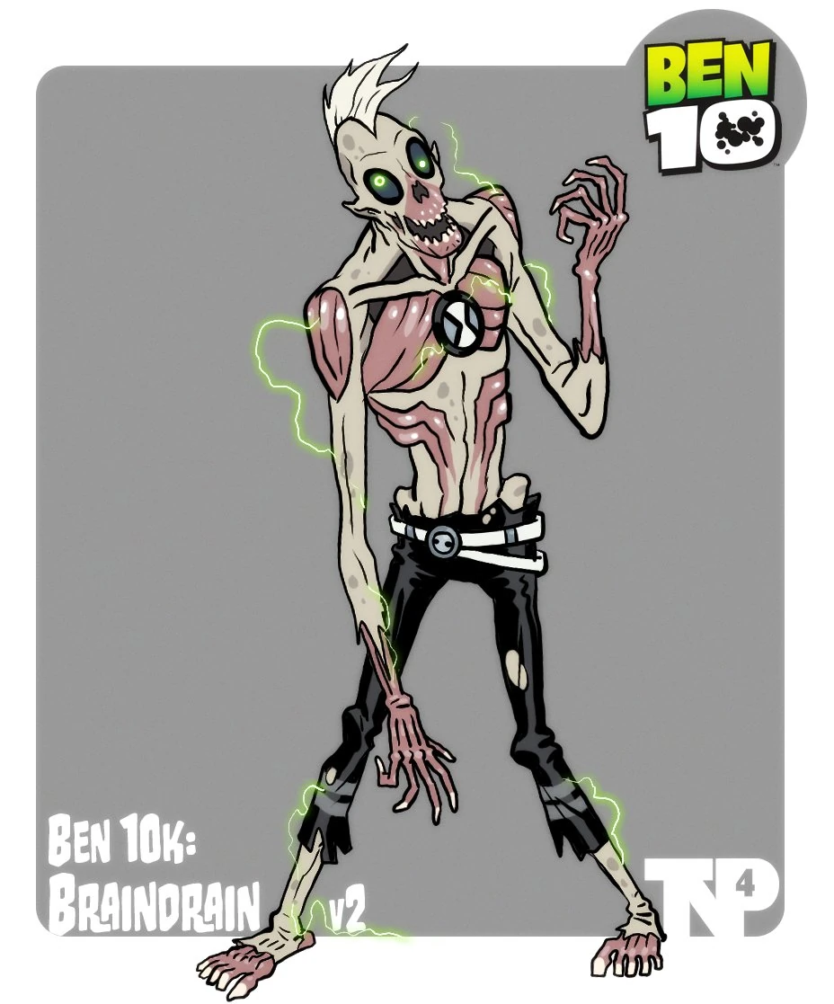 Na primeira versão revelada por Tom Perkins, Braindrain é semelhante a um zumbi clássico, com corpo esquelético, músculos aparentes e pele acinzentada. Seu cabelo é branco e seus olhos são pretos com pupilas verdes. O símbolo do Omnitrix se localiza em seu peito.