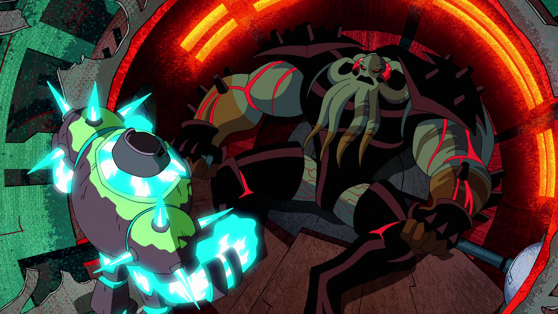 - Бен уничтожает Боевого Робота и захватывает его пилота, Вилгакса, с помощью Шок-Рока.