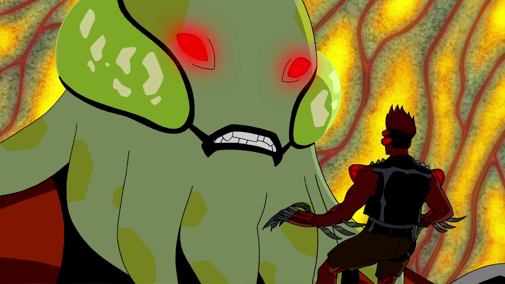 В пустом месте Вилгакс говорит Бену, чтобы он очень боялся, произнося типичную злодейскую речь о том, чтобы вернуть то, что принадлежит ему, и уничтожить его, чтобы забрать его. Бен ничего не говорит в течение всего обмена. Затем Вилгакс, кажется, проглатывает Плазму.