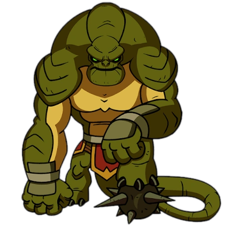 Basher is a swamp green Vaxasaurian wearing brown breifs with a red and yellow loincloth, alongside a pair of grey wrist guards. The weapon on the end of his tail resembles a flail.