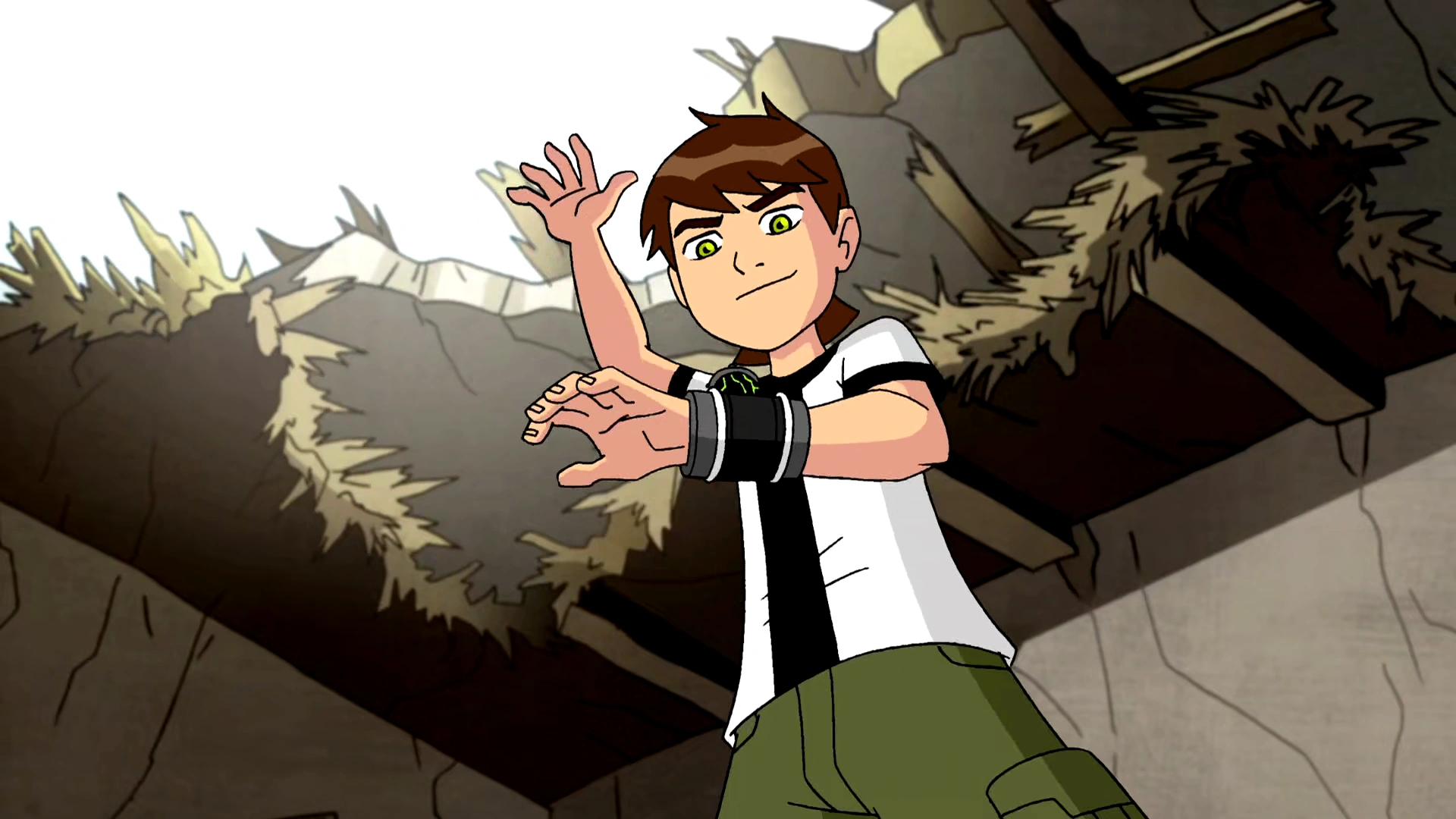 Ben's usual clothes consisted of a black-striped, white shirt with short sleeves, military green cargo pants with side pockets with a black belt hidden under his shirt, and black and white sneakers with black stripes. Ben wore the Omnitrix on his left wrist.