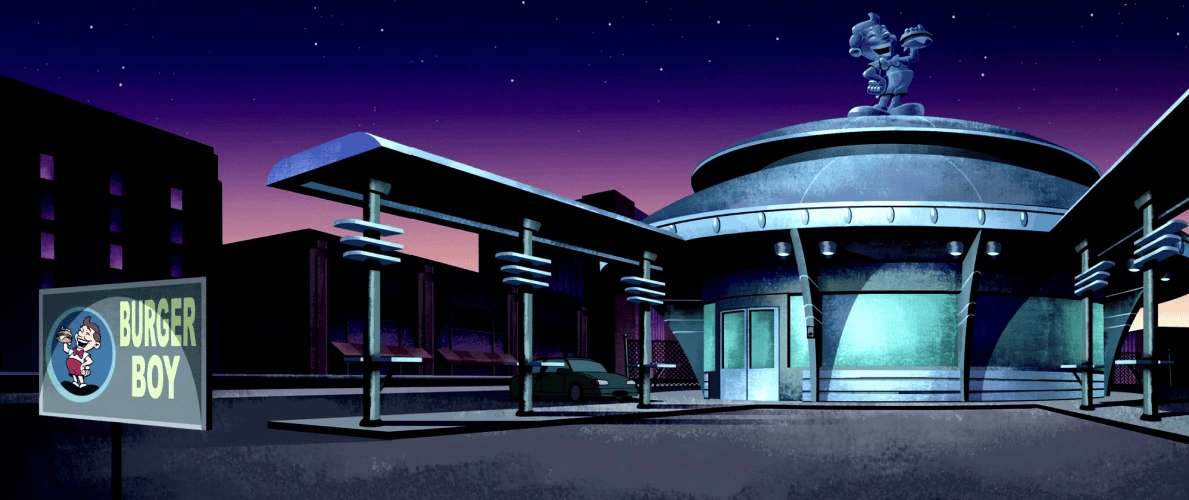 Burger Boy is a futuristic-looking cylindrical building with a domed top. Atop the dome stands a metal statue of the location's mascot, Burger Boy, though Big Chill has eaten the statue's left hand, its burger, and its head. The building has a canopy surrounding all sides of it, which juts out at two points. These sections have tables beneath the canopies for patrons to eat at, though it lacks seating. Between these canopies is the entrance, which is a pair of silver double doors with glass windows. The rest of the structure is similar, consisting of walls largely made up of panes, interrupted by the occasional support beam. Lights dot the side and underside of the canopy.