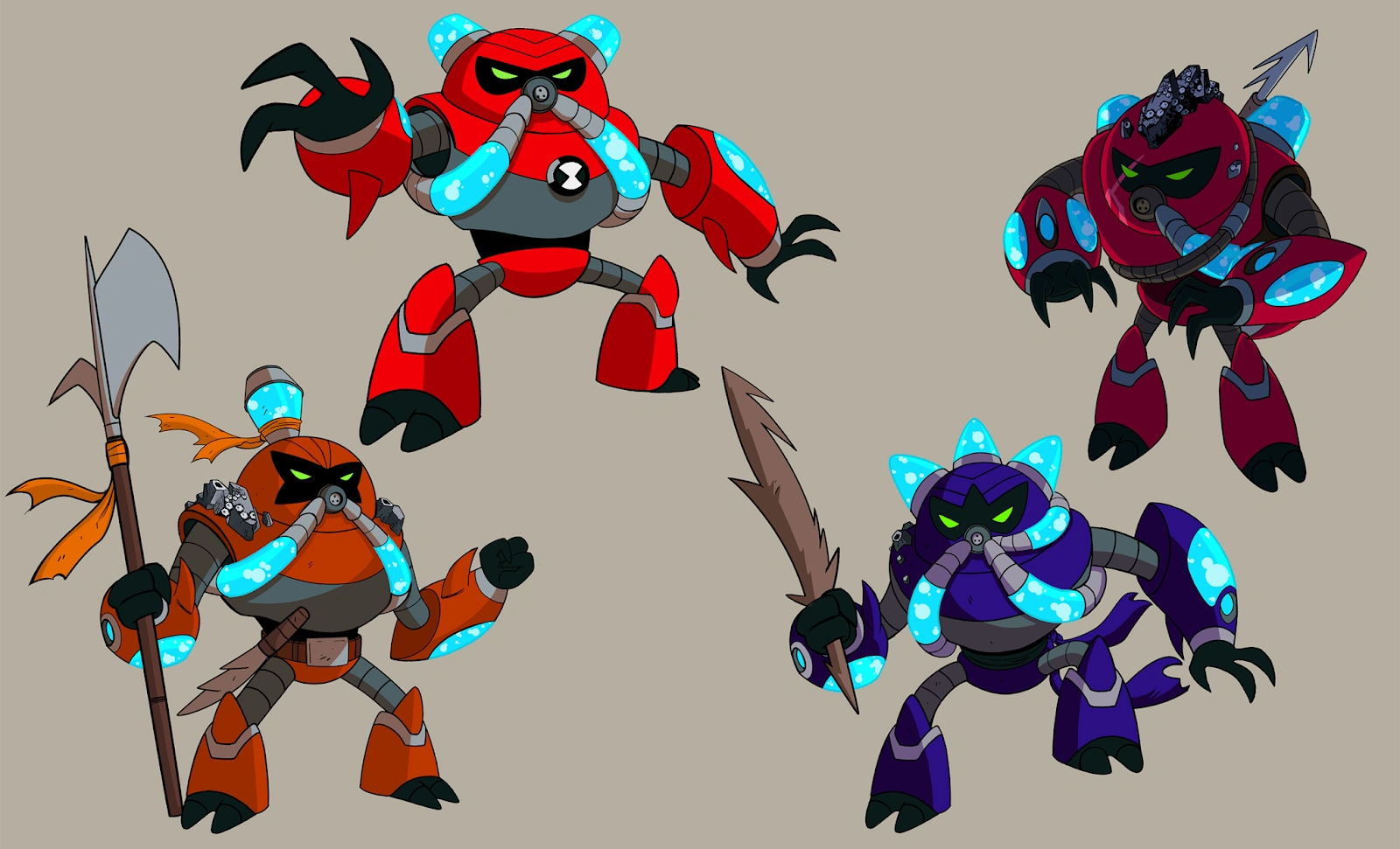 Each specimen is a large humanoid creature with an armored exoskeleton. This exoskeleton has one to three tanks on the head, and two tubes that extend from their respirator to a unit on the back. They have jets on their hands that shoot out water from two extra tanks in the forearms. They have green eyes, three fingers, and two toes.
