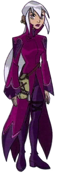In the Original Series, Charmcaster wore a magenta coat with purple at the ends. Underneath, she wore purple turtleneck, pants, long heeled boots with black straps around them. She wore her magical bag around her waist. Charmcaster wore her long silver hair in a low ponytail, and had light purple and pinkish eyes, along with purple lipstick. She also wore two earrings on each ear.