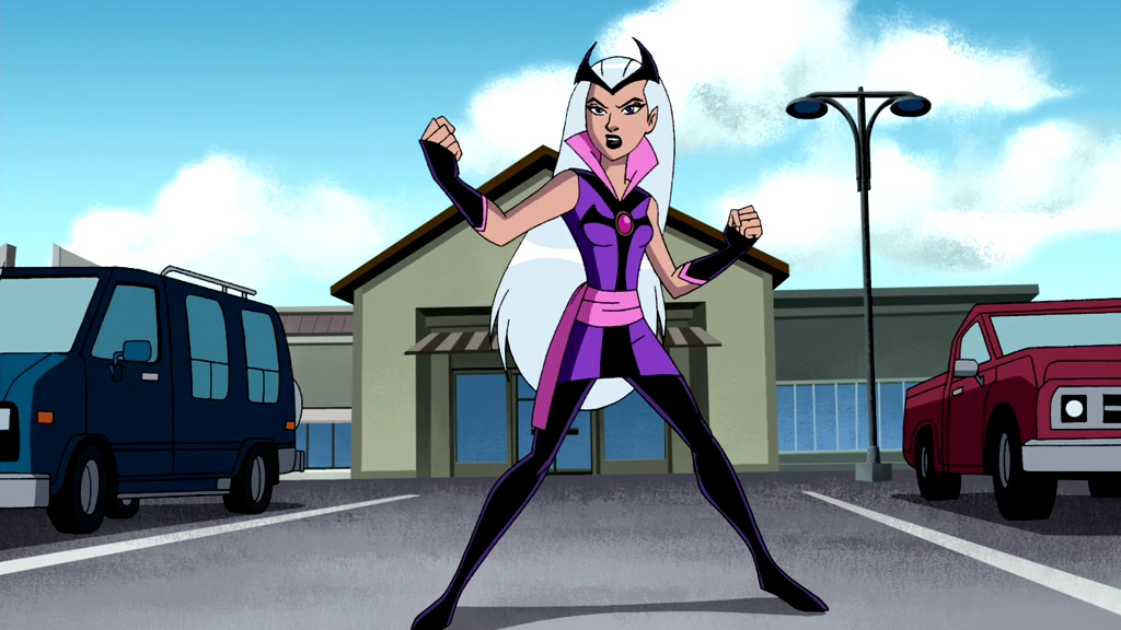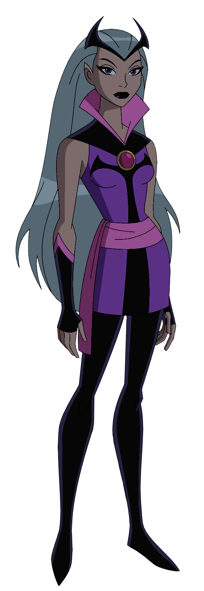 In Alien Force and Ultimate Alien, Charmcaster wore a purple dress with pink ribbon around her waist and high collar, black accents around the the shoulders and the front from the chest to the end of the dress like a cross, and a black crown on her head. She also wore black fingerless gloves with pink trimming at the ends. At the top of her dress, she had a cerise, pink gem with a golden border, and she also wore long dark purple flat boots. She wore her long silver hair laid out that extended to her thighs, orchid eyes, and very dark purple lipstick. She looked slightly thinner and taller, and her ears were pointed lacking the earrings this time.