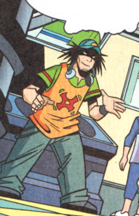 DJ Zenut appears as a spike-y, long black-haired human male, wearing a blue and red cap, baggy trousers and an orange vest over top of his green T-shirt. His vest includes a red graphic in its center: a rotated cross with a hole in its middle, with smoothed arcs making up the edges. Along with this he sports black strands of facial hair and wears a single black band on his right wrist.