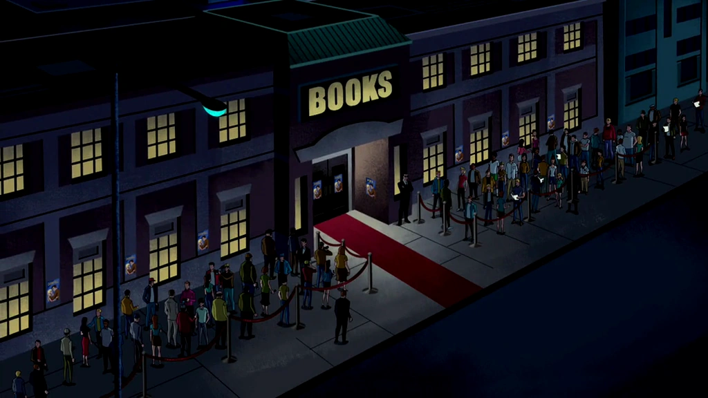 Daldon's Books is a large building situated between two other buildings. It spans two levels, with the front side of the building having sixteen windows, four on each end of each floor. It has a green angular roof, and a sign reading "BOOKS" above the entrance. The entranceway is covered by the upper floor, and consists of a pair of double doors. A red carpet preceded the entrance, several stanchions lined the sidewalk surrounding the building, and the walls were covered in Darkfall posters. Inside, several bookshelves spanned the bottom floor.