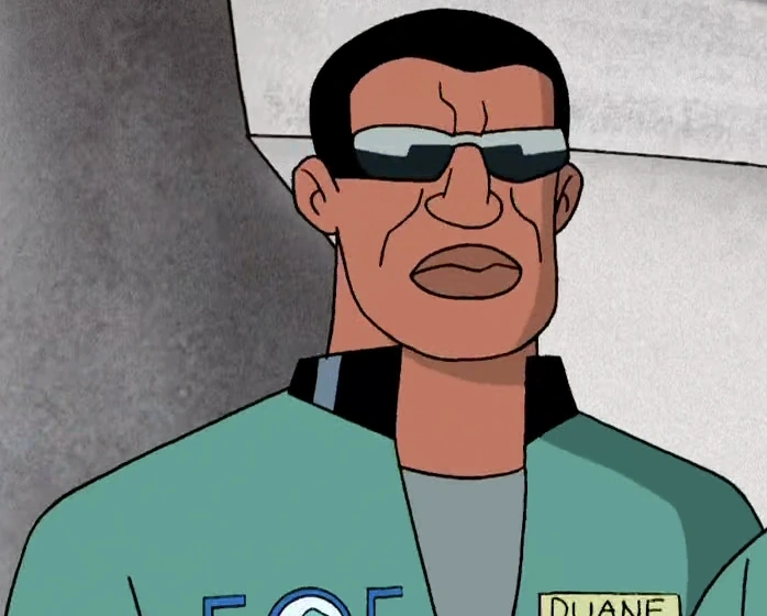 Duane is a tall, African-American man with short, black hair who wears black glasses. He wore two different suits, one of them being a cyan uniform with black accents and boots with his name and the "Friends of Fish" logo on it, and the other was a silver diving suit with an oxygen pack and belts with pockets, which covered everything but his head.