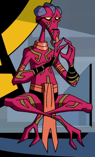 Dubba is a thin, red-skinned alien with several symbols around his body. On top of his head, he has three bands that look like stone. He has an orange ring on his chin, and a collar of the same color on his neck. He's wearing black underwear, with a claire orange phantom wrapped around the top. He wears black bracelets, with gold details on each of his arms.