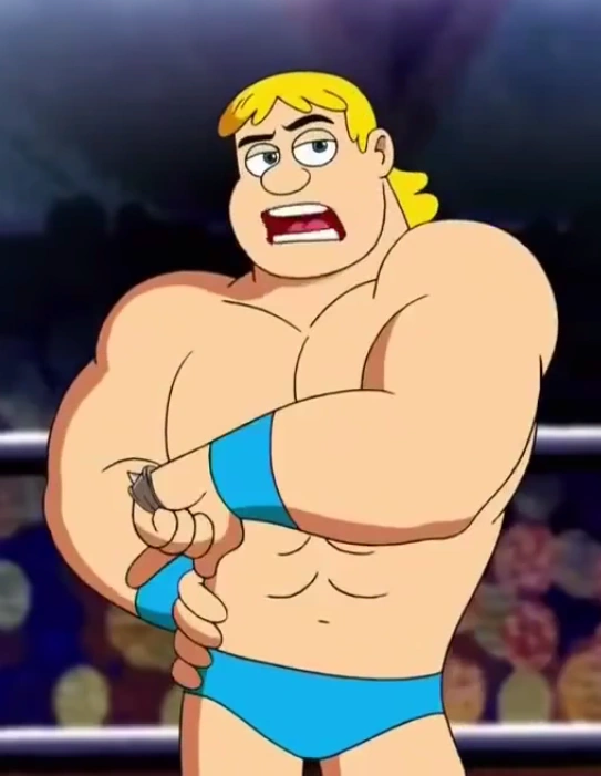 He has well-developed muscles and a blonde mullet that reaches down to his back. He wears sky blue wrestling briefs with wristbands of the same color, dark blue and white shoes and knee braces, and a spiked gray brass knuckle on his left knuckles.
