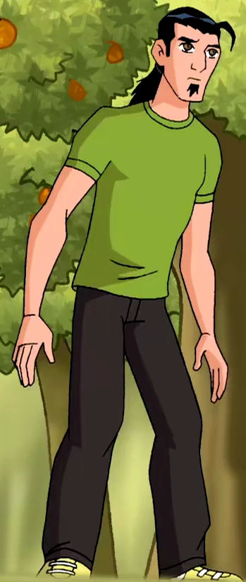 Hector is a man with fair skin and brown eyes. His hair is black, being tied into a ponytail, and he has a goatee. He wears a green shirt, black jeans, and yellow sneakers.