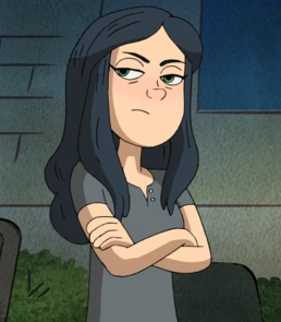 Jenna's actress is a fairly skinned young woman with light green and shoulder lenght black hair. She wears a short sleeved gray shirt and black pants.