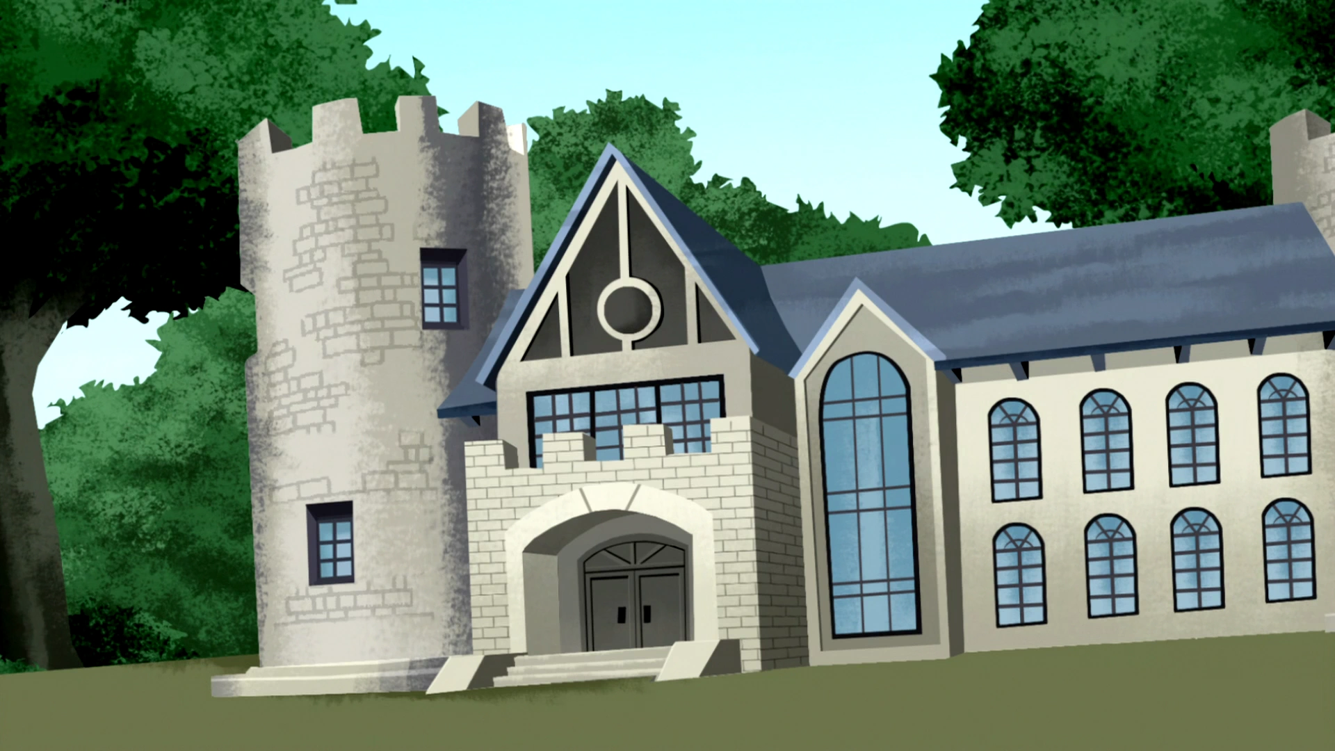 Lancelot Lake Estates has many copies of the same building. They resemble a mix between a castle and a mansion. They were white and grey with large blue windows, with a circular tower on their rights. The roofs were triangular with blue slate. The entrances were two doors with an overhead shelter.
