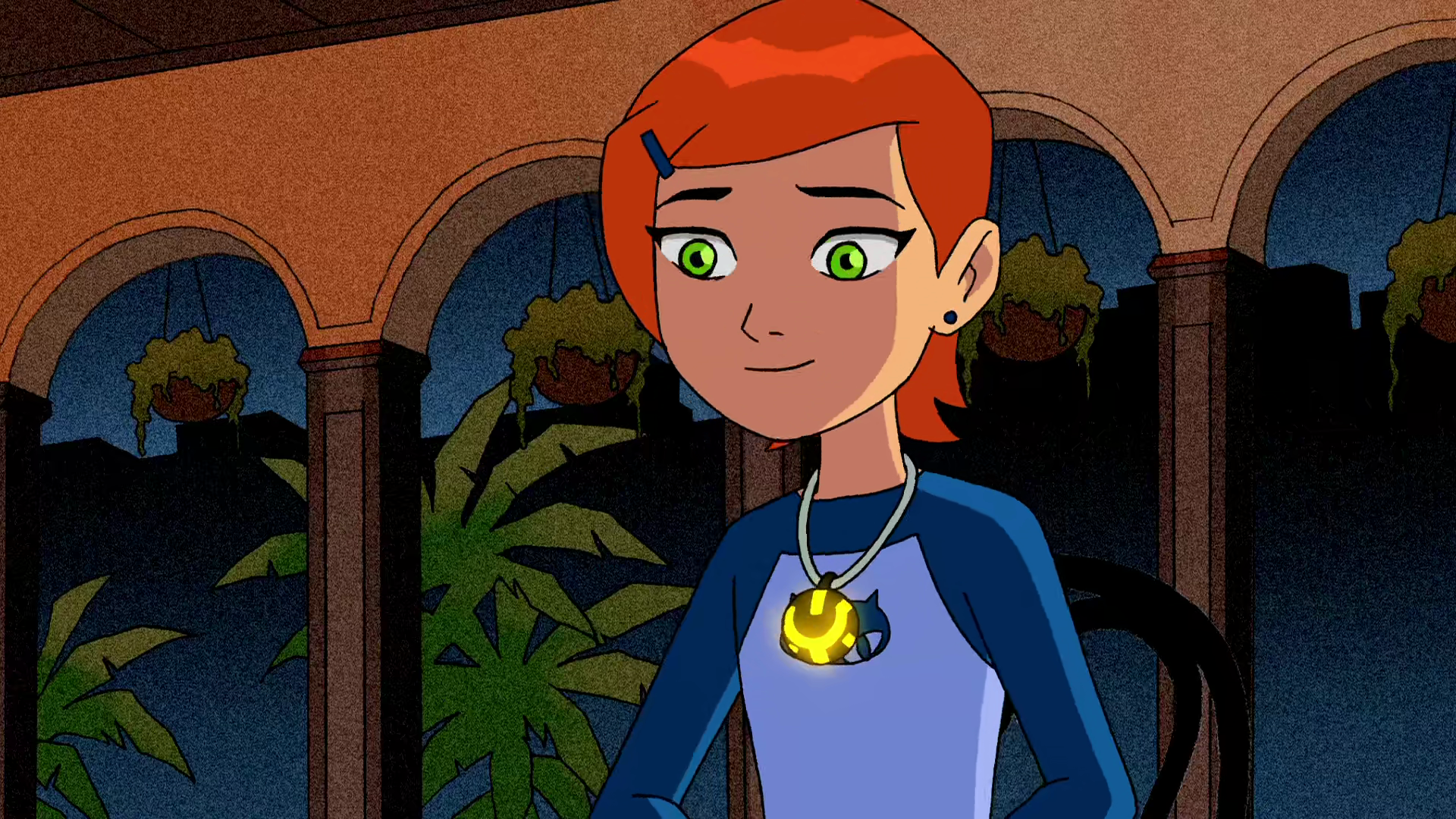 In the RV, Ben and Max are sleeping. Max is snoring rather loudly, so Ben looks to Gwen, who happens to be missing. She is in a basketball court with the charm active, tossing a basketball at the hoop behind her without looking. The ball does not even hit the basket, but yet another series of improbable events lead it directly to the net. Gwen implies that she's done this several times already. Ben takes the ball and asks how she managed to do that. She says that whenever the charm glows, everything goes her way. Max wakes up, asking them if they want breakfast. Just then, at a nearby construction site, an explosion causes the cables on a lift to break, leaving two workers stranded high above the ground and hanging by a thread. Ben figures that it's time to help, but is interrupted by Gwen, who figures she should help and takes off. Ben ignores this and transforms into Wildmutt.