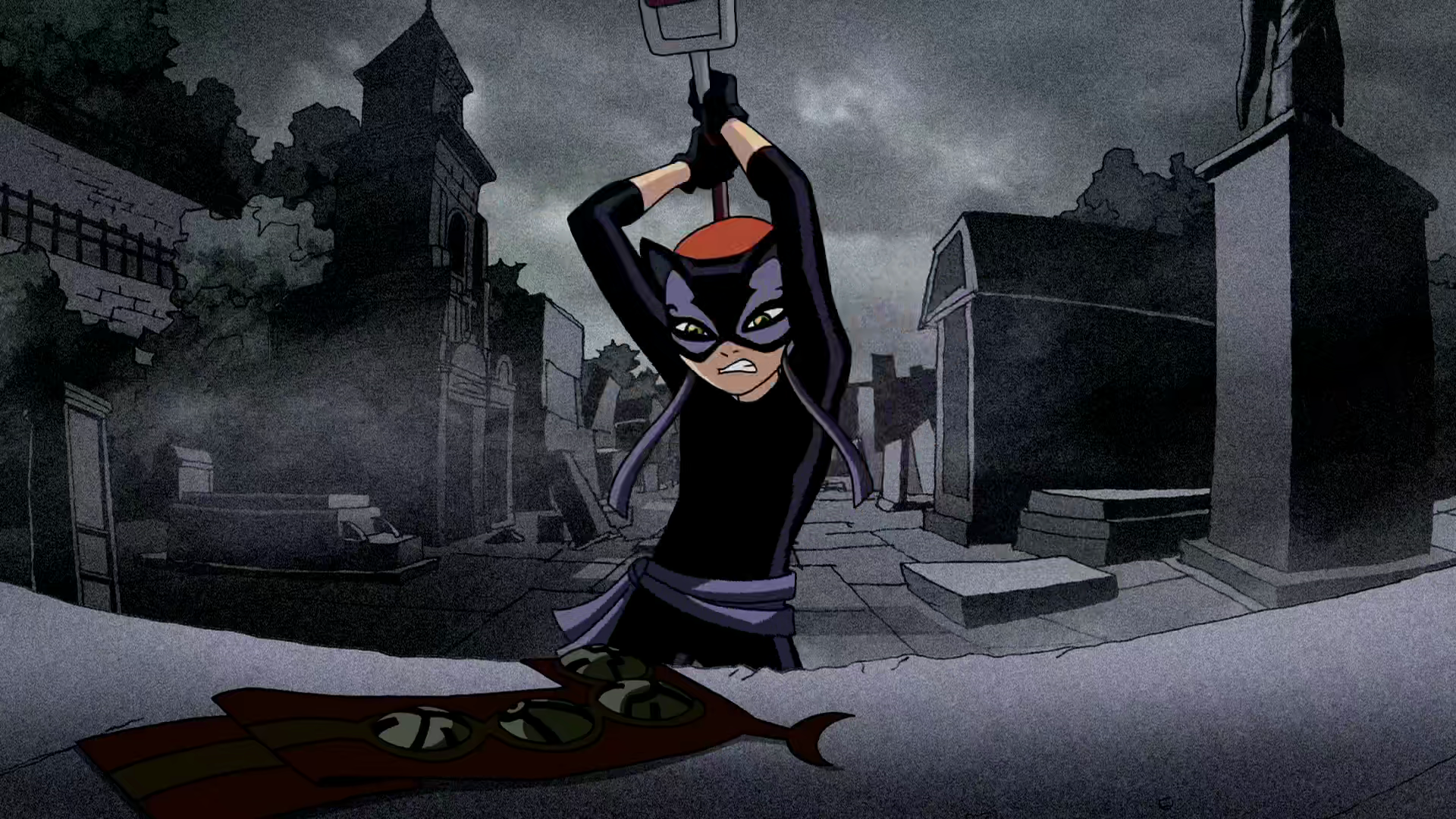 Within the passage, Lucky Girl and Hex end up in the catacombs of the house. Hex finds her rather quickly, but the charm once again allows Lucky Girl to escape. This time, she leans on a stone and knocks it out of place, dropping the roof on Hex. He shields himself and continues to chase her. As he tries to blast her, Lucky Girl's charm drags her to the floor, making an opening for her that leads into the graveyard.