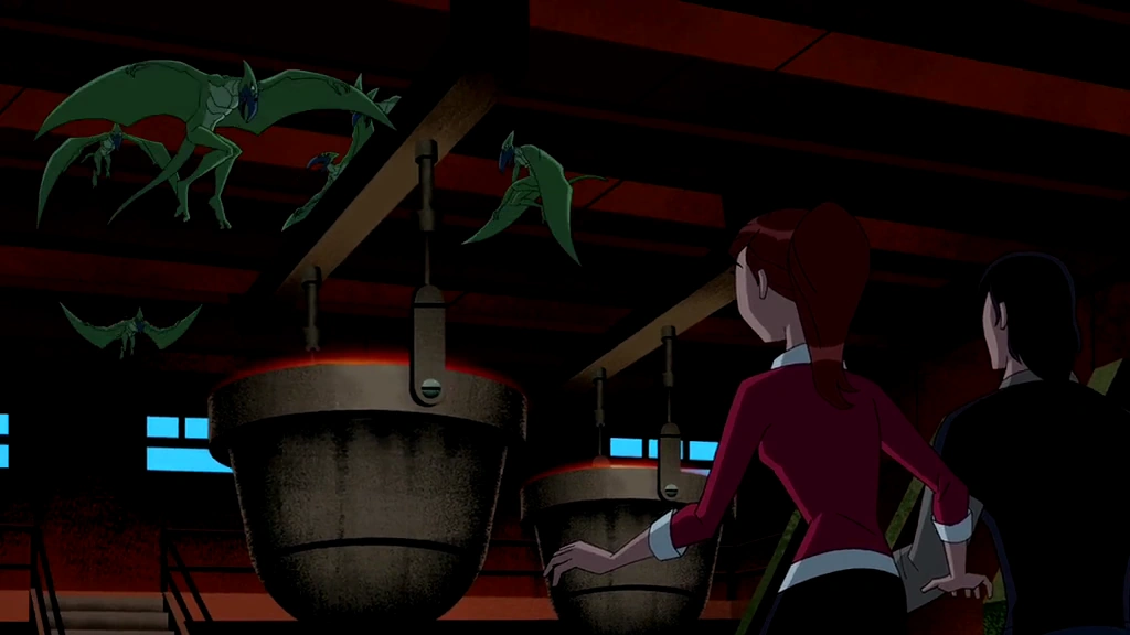 In The Eggman Cometh, the team tried to get the Sheriff of Bellwood to arrest Dr. Animo, but he said that news of pterodactyls getting out would ruin the reopening of the Monongahela Foundry and kicked them out. Later, some pterodactyls wreaked havoc at the foundry because they wanted the heat from the melting steel. Ben, Gwen, and Kevin showed up (with Ben transforming into Big Chill) and easily stopped them by entrapping them in ice.