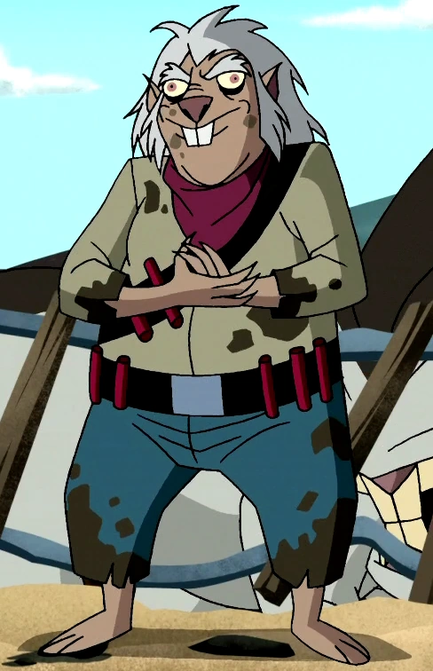 Mouldywarp stands just over Ben's height, and just under Kevin's. He has dark skin and wears a khaki shirt, jeans, and a belt and bandolier of dynamite sticks. He has a flat face with a sticking out nose and also has long white messy hair and two big bucked teeth. He does not wear shoes and has spots of dirt all over his clothes and on his face. He has pointed ears, four fingers and three toes on each hand and foot respectively.