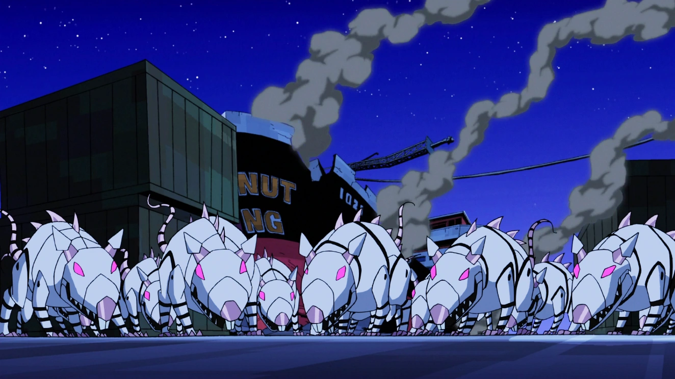 They are white robotic mice with sharp blades down their spines and pink eyes. They are as large as a common housecat.