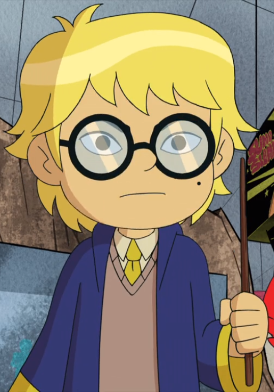 He is a blond boy with glasses. He has a mole on his right cheek. He wears a white shirt with a yellow tie and a light brown diver over it. Above the diver is a blue suit with gold sleeves.