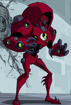Orishan are a red mollusk-like species. They have two large eyes in Ultimate Alien and four slitted and rectangular eyes in Omniverse. They have small grey spikes and black spots on the back of their legs and shoulders. Their mouth is similar to that of a crab's.