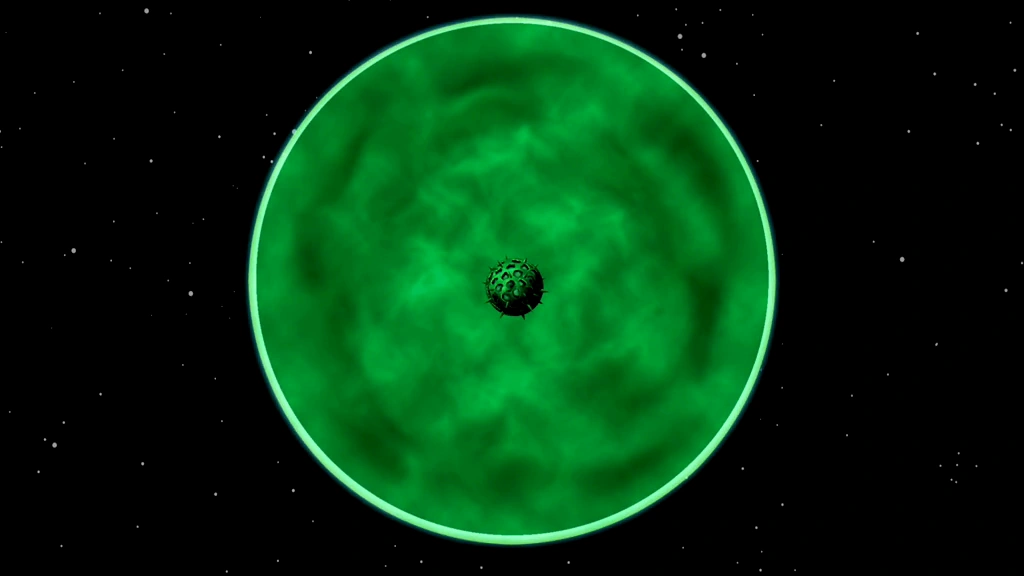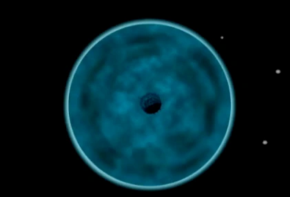Piscciss can be described as a large, planet-sized mass of ocean, with the only pieces of land being wayward floating rocks and the central core, which is noted to make up less than 2% of the planet's total mass.[3] Piscciss' water is bound by an artificial gravitational multiplier at the center of the core, which generates centripetal force, keeping a liquid atmosphere held together.[4][1]