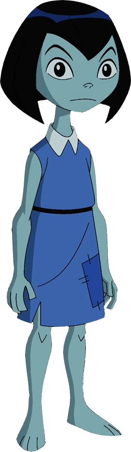 Probity has blue skin, black hair, and wears a blue dress. She is also shown to be barefoot.