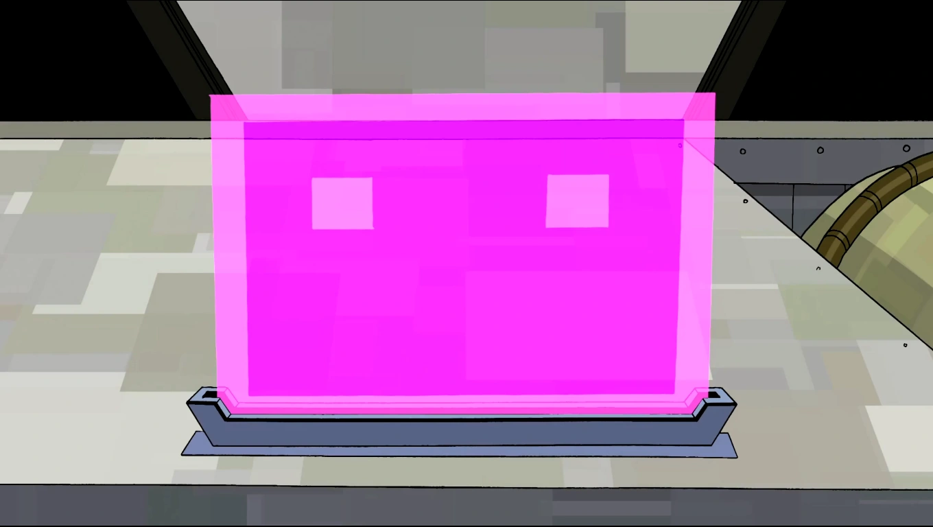 Pyxi is a pink holographic rectangle with two smaller rectangles for eyes. Pyxi's holographic head is similar to OTTO.