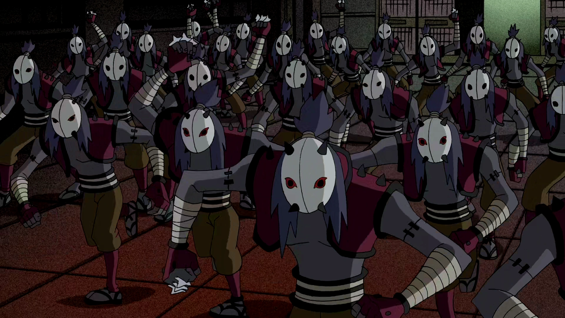 In Original Series, the samurai have kabuki masks, gray hair and skin, and crimson red vests. The boss samurai has spiky hair, samurai armor and swords.