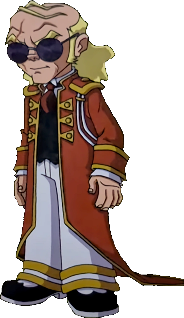 He wears a red ringleader coat, a white dress shirt with a red tie and a black dress vest. He wears white dress pants. He always wears purple rounded sunglasses.