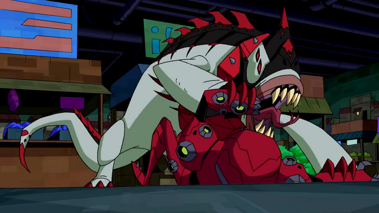 Meanwhile, back in the tunnel, Khyber calls his pet and picks up NRG's spit. He sees the wrecked track and sends his pet to Ben. Khyber's pet transforms into Buglizard and runs off to find Ben. Ben explores Undertown, though Rook thinks that they should be chasing the gang. Ben tries to buy food, but Rook scares off the tentacle vendor by flashing his badge and trying to interrogate him. As they walk around, Rook tells Ben that he learned to fight protecting wheat from alien rodents on his homeworld and he is anxious to continue the investigation. Ben says that the 'big bad' will eventually send the lowlifes after him and Rook interrogates aliens as Ben looks for food. Suddenly, Buglizard arrives at the marketplace and frightens the citizens.
