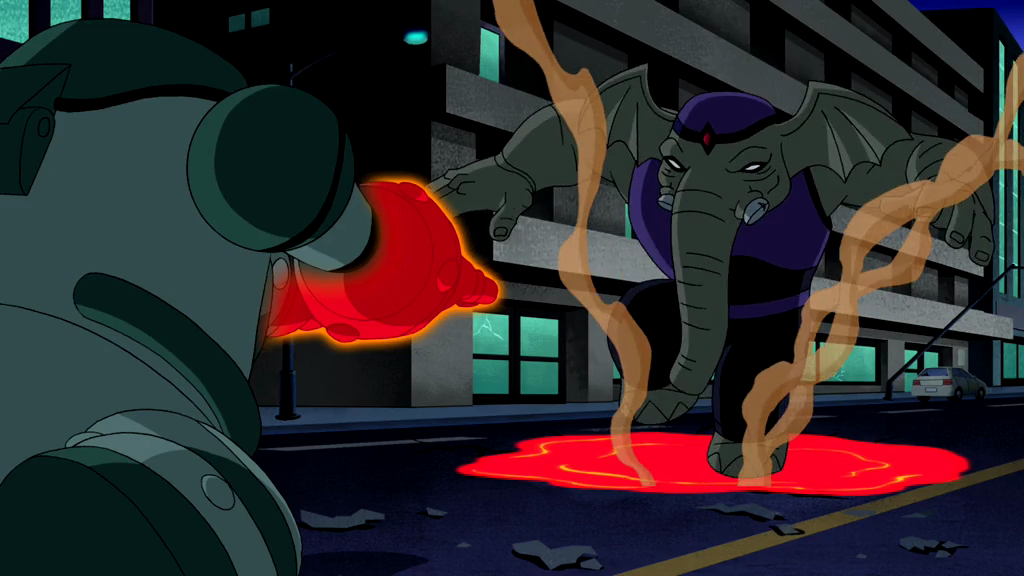 - After Ben escapes his shackles, he turns into Humungousaur instead of NRG. He also remains Humungousaur during his trial by combat instead of using Spidermonkey and Ultimate Spidermonkey.