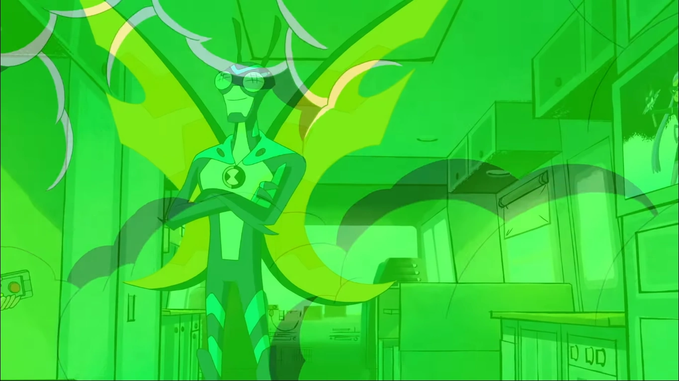 Ben clicks through the channels on the television in the Rustbucket, bored waiting on Max to get back from the annual Sample Scramble event at Biggie Box. Gwen sympathizes with him, but points out that Xingo is on. Ben responds by saying he isn't feeling it. Gwen decides to change the channel to Lucky Girl, and Ben and Gwen begin to fight over the remote. Ben transforms into Stinkfly in order to get the remote back. On the television, Lucky Girl and the Omega Lucky Scouts face off against Queen Griefenstein. The screen zooms out to a TV display in Biggie Box, which Kevin walks by. He takes a universal remote and turns to the TV, prompting two moms to remark how nice it is to see a boy in touch with his emotions.