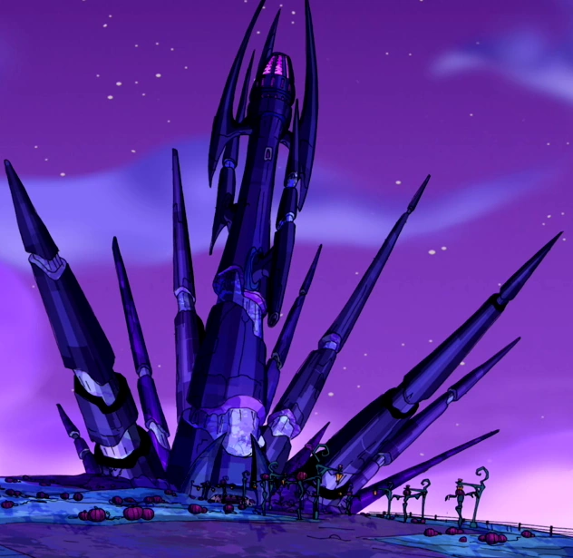 It is a large castle and is surrounded by various spikes. The main building has four spikes and pink windows on top. There are some gaps between the spikes. The entrance can be found in the main building, guarded by Magical Pumpkin.